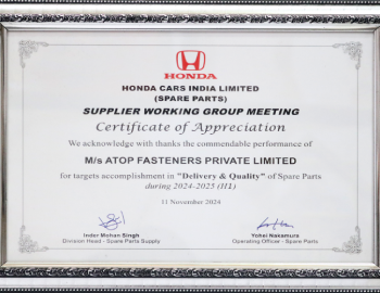 Atop Fasteners Private Limited (AFPL) is one of the leading automotive component manufacturers in India. The company has been serving OEMs in the Passenger Vehicles, Two Wheelers, Commercial Vehicles, and Tractors & Farm Equipment, Construction Equipment and Power Equipment Segments as their principal components partner for the past 37 years.